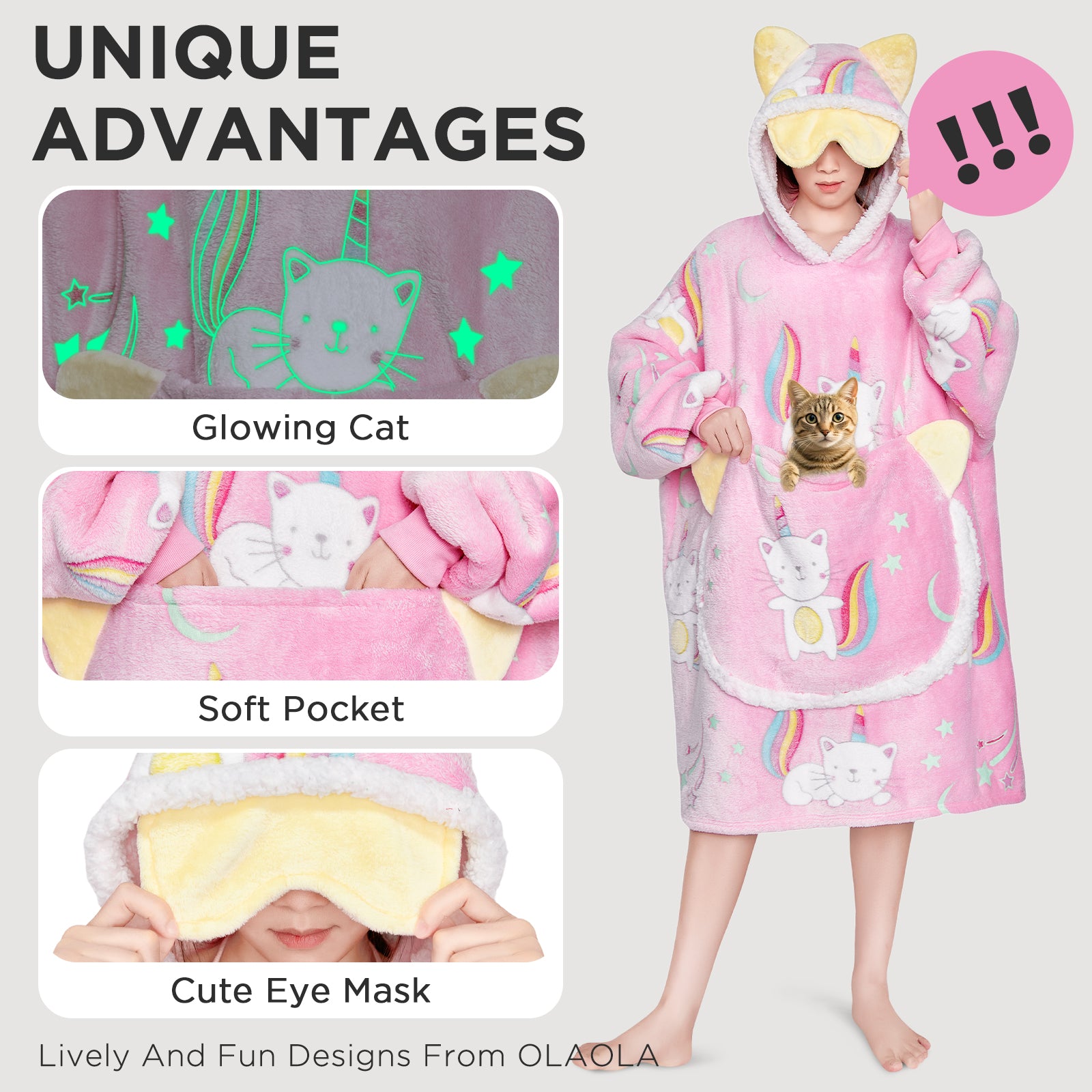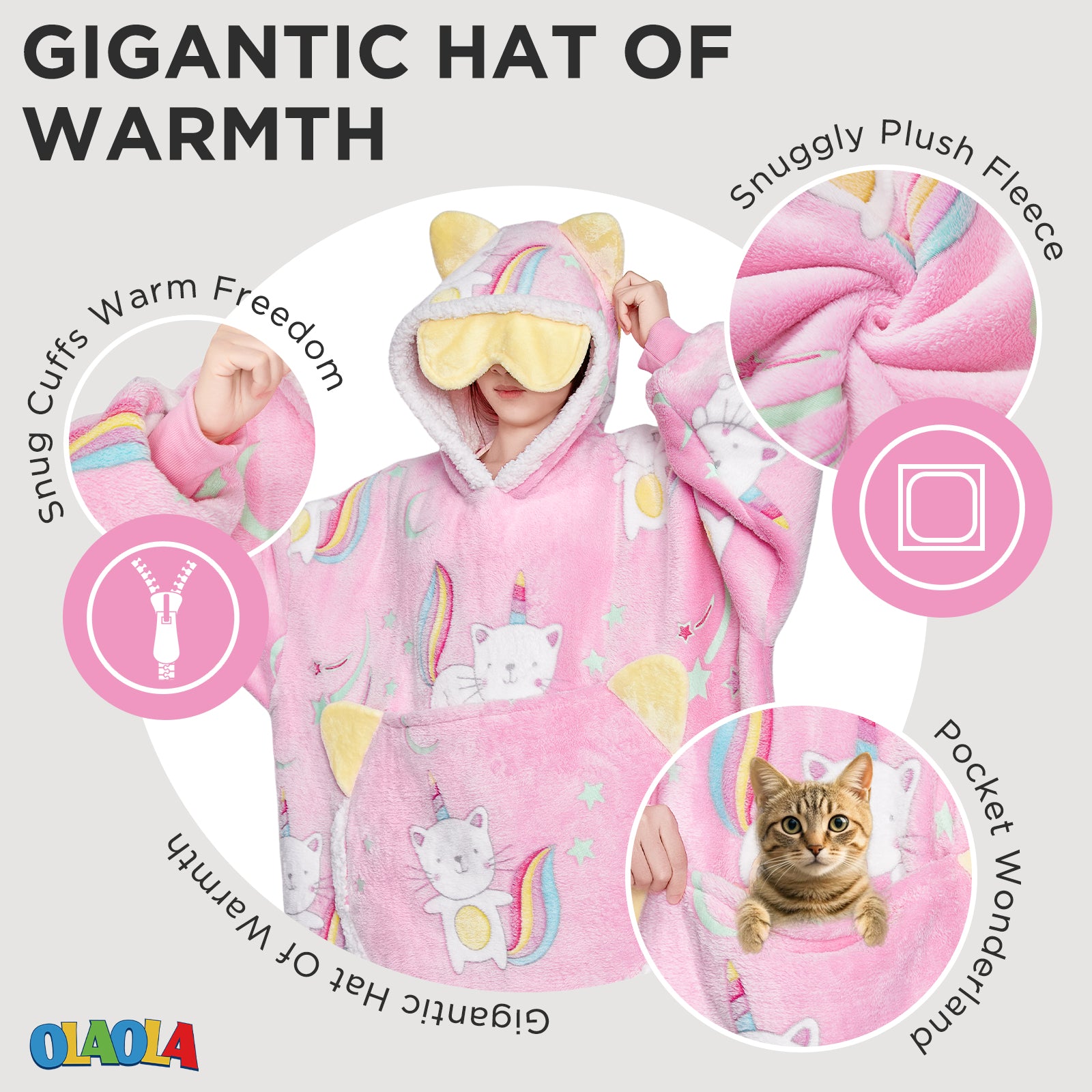 OLAOLA Printed Cat Luminous Pink Wearable Hoodie Animals Onesie Oversized Soft Homwear For Adult