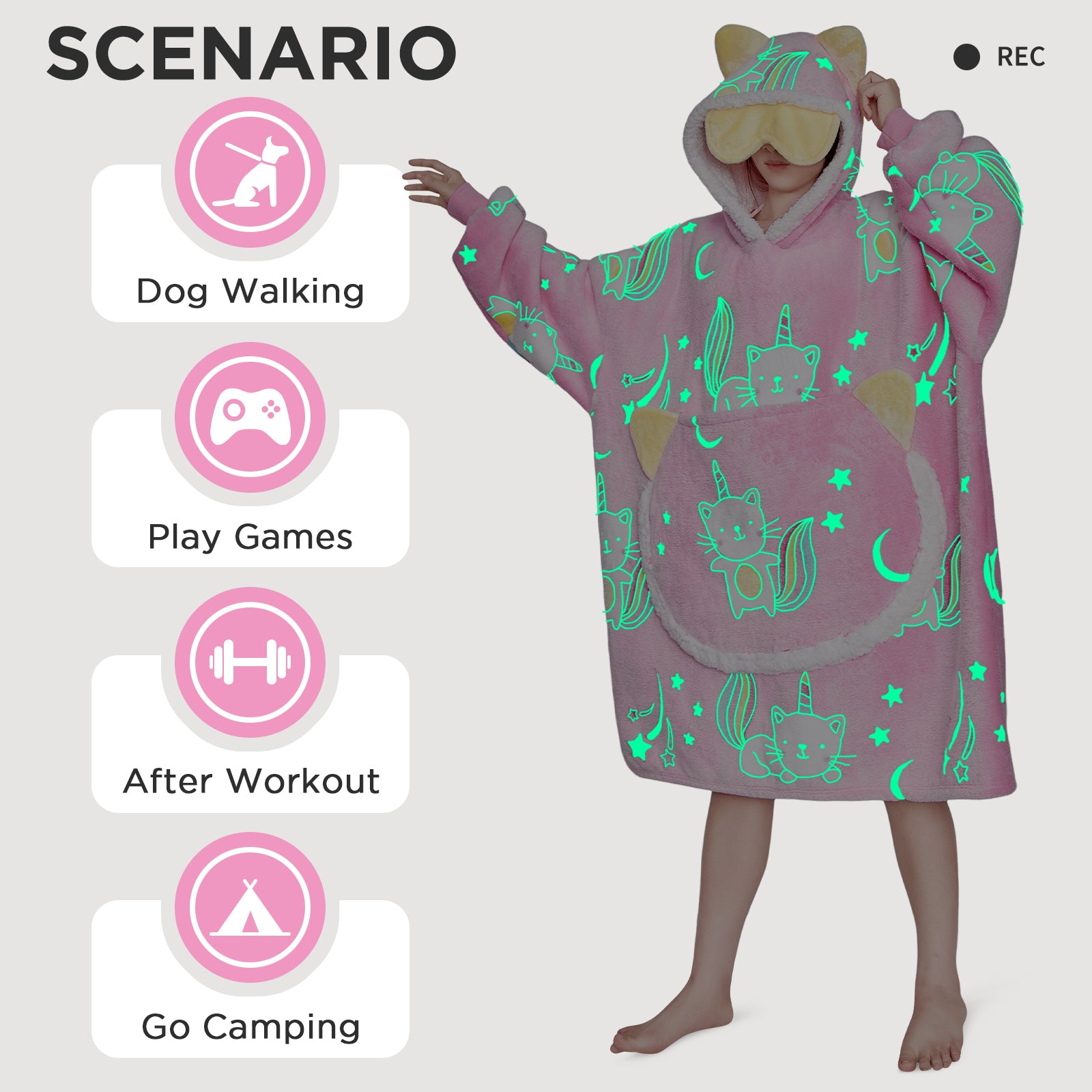 OLAOLA Printed Cat Luminous Glow In The Dark Pink Wearable Hoodie Animals Onesie Oversized Soft Homwear For Adult