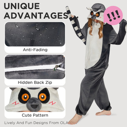 OLAOLA Ring-Tailed Lemur Pajamas Monkey Animals Onesie Plush Warm Home One Piece For Adult Unisex Halloween Costume